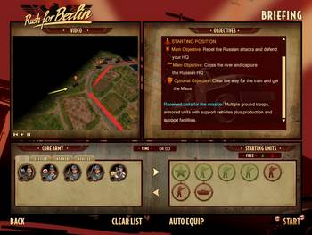 ![]() | Titre attendu ce printemps, il nous intéressait de voir ce que ce Rush for Berlin avait dans le ventre, nous chargeons donc la démo et l'installons sans problème technique, en plus le jeu ne se montre apparemment pas trop gourmand en ressource, ayant pu jouer la démo sans le moindre lag sur un PC de 3 ans (2.4 Ghz). La démo n'offre qu'une seule et unique mission solo, ce qui ne permet donc pas de ce faire un idée sur l'idée forte de ce jeu, qui est cette course, pour être la première armée à entrer dans Berlin. Mais ne boudons pas notre plaisir et lançons nous sur cette mission. |