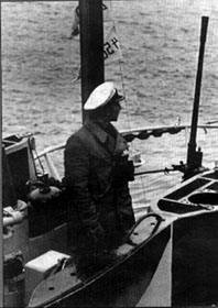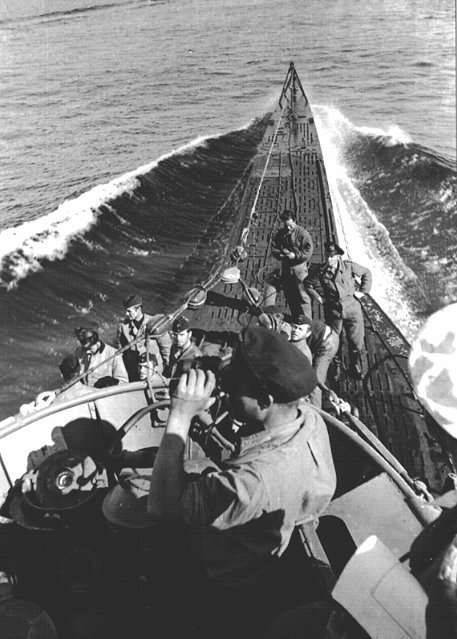 L’U47 dans le port de Kiel le 24 octobre 1939 10 jours après le raid sur scapa flow. Le Korvetten Kapitän Prien se tient en haut de la baignoire sur la gauche. |