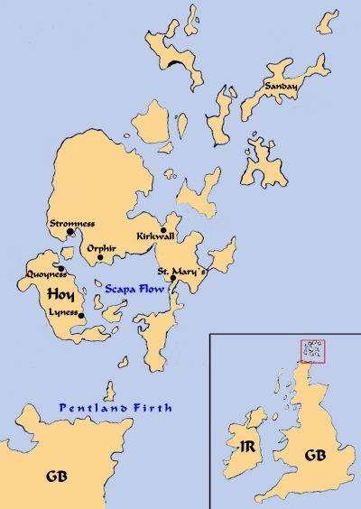 Le 13 octobre 1939 au soir, Prien et son U-47 se trouvaient devant les îles Orcades, d'où l'on pouvait apercevoir l'entrée du port. Le capitaine espérait maintenant qu'il arriverait à temps. Il n'était pas impossible, en effet, que la flotte britannique eut, brusquement, décidé de prendre le large. Dans ce cas, il faudrait ouvrir tout de suite le feu et tâcher de couler quelques unités. |