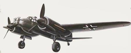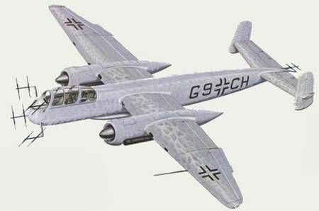 de chasse de nuit. En 1942, le manque de chasseurs de nuit provoqua la conversion de bombardiers classiques Do-217. 364 bombardiers Do-217 E-2 et Do-217 M furent ainsi modifiés en chasseurs de nuit Do-217 J et Do-217 N respectivement. Le Do-217 N-1 (notre document) était pourvu de 2 moteurs Daimler-Benz de 1 750 CV. Vitesse maximum : 515 km/h. Autonomie maximum : 2 500 km. Armement : 4 canons de 20 et 4 mitrailleuses de 7,9 vers l'avant. 1 mitrailleuse de 13 de défense supérieure. 1 mitrailleuse de 13 de défense inférieure. Radar FuG 202 Liechtenstein. |