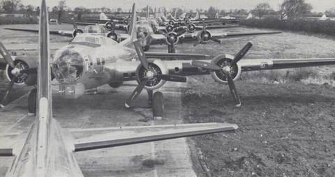 ![]() « Forteresse volantes », B-17 G, a leur arrivée en Angleterre, attendent d’être livrées aux unités combattantes. |