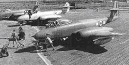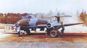 Frank Whittle déposa, dès 1930, un brevet sur un système de turbine à gaz. Il fallut toutefois attendre le mois de juillet 1939 pour que l'Air Ministry prenne commande d'un turboréacteur destiné à la propulsion d'un avion. Une étape décisive venait d'être fran chie. En février 1940, la firme Gloster Aircraft se vit charger de mettre au point une machine expérimentale afin de tester ce nouveau mode de propulsion. En mai 1941, alors que le monoréacteur E.28/39 prit l'air pour la première fois, les études concernant la mise au point d'un chasseur bi réacteur étaient déjà bien avancées. Elles débouchèrent sur le Gloster Meteor qui réalisa son premier vol au mois de mars 1943 et fut pris en compte en juillet 1944 par le Squadron 616. Cette unité, qui opérait depuis les bases de la R.A.F. de Culmenhead et Manston, avait essentiellement pour mission d'intercepter les bombes volantes V1. La première interception intervint dès le 27 juillet, mais les canons de l'avion s'enrayèrent. Huit jours plus tard, un pilote de Meteor croisa de nou veau la route d'un VI et réussit à l'abattre non pas avec ses canons mais en le faisant basculer du bout de l'aile, ce qui eut pour effet de fausser le dispositif de contrôle de l'engin. Ce fut seulement le 15 août qu'un Meteor descendit pour la première fois un V1 à l'aide de ses quatre canons Hispano de 20 mm. Le Squadron 616 fut par la suite détaché aux Pays-Bas où ses avions participèrent, aux côtés de la 2 nd Tactical Air Force alliée, aux ultimes combats au-dessus de l'Allemagne.