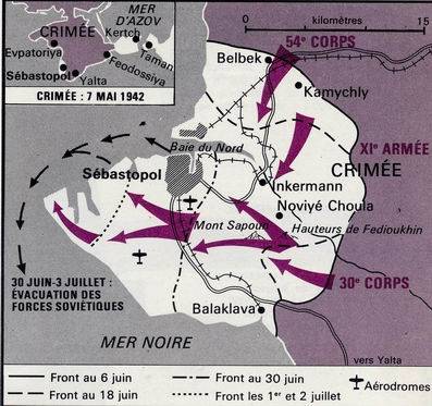 Pour défendre Sébastopol, l'armée côtière soviétique disposait de près de 106 000 hommes, de 600 canons, d'environ 100 mortiers et de 38 chars ; les aérodromes soviétiques du périmètre de défense alignaient 55 avions en état de vol. De son côté, la Xle armée allemande était forte de 204 000 hommes, de 670 canons —de calibres allant de 76 à 800 — 450 mortiers, 720 chars et 600 avions. Pour isoler la ville de la mer, les Allemands employèrent une flotte de navires de guerre côtiers basés à Yalta, à Evpatoriya et à Feodossiya. Après cinq jours de préparation d'artillerie et de bombardements aériens, les premières troupes d'assaut passèrent à l'action le 7 juin au matin. La poussée principale, confiée au 54e corps, s'exerçait dans le secteur Belbek-Kamychly. Le 30e corps, quant à lui, faisait pression le long de l'autoroute de Yalta. Les Allemands avaient espéré disloquer le front et réduire la défense peu à peu, mais les Soviétiques résistèrent avec acharnement et les assaillants durent s'arrêter après quelques succès locaux. Ils ne réussirent à percer jusqu'à la baie du Nord que le 18 juin, après l'arrivée de renforts détachés de la XVIIe armée. Le 23, les Russes se retirèrent au sud de la baie, maintenant ainsi leur front, mais leur situation était désormais sans espoir. Les munitions allaient manquer et, après le 26, aucun navire de surface ne se trouva plus en mesure d'acheminer renforts et matériel à destination de la ville assiégée. Dans la nuit du 28 au 29, les Allemands établirent une tête de pont sur la rive méridionale de la baie du Nord. Et lorsqu'ils pénétrèrent dans Sébastopol, le 3 juillet, l'évacuation commença. |