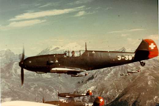 Vol en escadrille sur les Alpes, des Me 109 E-3, construit sous licence