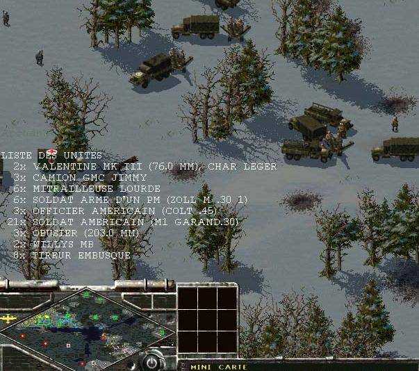 | Sur ce screenshoot, je vous ai sélectionné toutes les troupes présentes et cachées afin de vous montrer leurs emplacements sous les arbres juste pour vous montrer l'intérêt de cette astuce. On peut y distinguer 2 chars, 2 canons anti-chars, 3 dépanneuses ainsi que 13 soldats et mon soldat placé en " suspension de tir " |