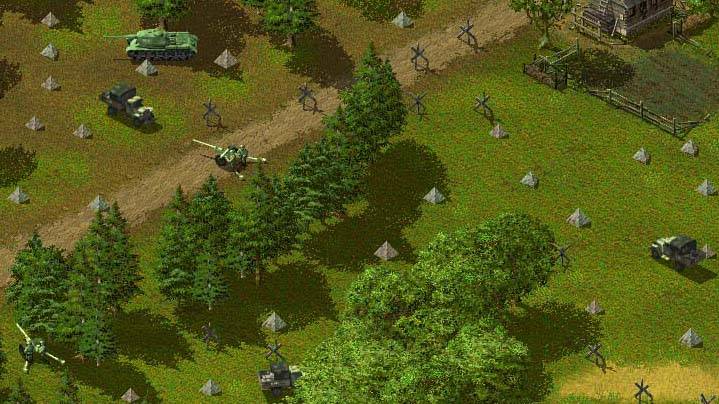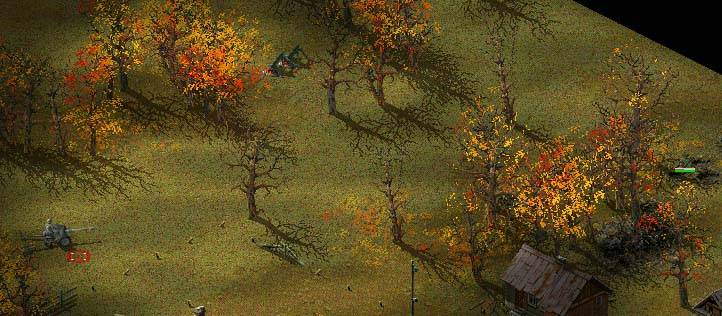 L'idéal dans une partie multijoueur, c'est de masquer à l'ennemi ses troupes le plus possible afin d'éviter qu'il repère vos unités rapidement, notamment lorsqu'il envoie des avions de reconnaissance. Alors, ne laissez pas vos troupes en pleins milieu de la route, il jouera alors les Bisons Futés à coup d'obusiers :). La méthode la plus appropriée à mon sens est, dans un premier temps, de disperser ses troupes les unes des autres afin d'éviter un amoncellement de chaires fraîches et de tôles. Dans un second temps, on les dissimulera sous les buissons, arbres ou derrière les bâtiments ou maisons. En cas d'envoi d'un d'avion de reconnaissance, il sera plus difficile de les repérer que si elles " errent " en plein milieu d'un champs ou d'une route. Sur ce screenshoot voici quelques troupes placées " idéalement " sur la carte, vous pouvez juste distinguer un homme dans la maison de gauche, où sont les autres !!!