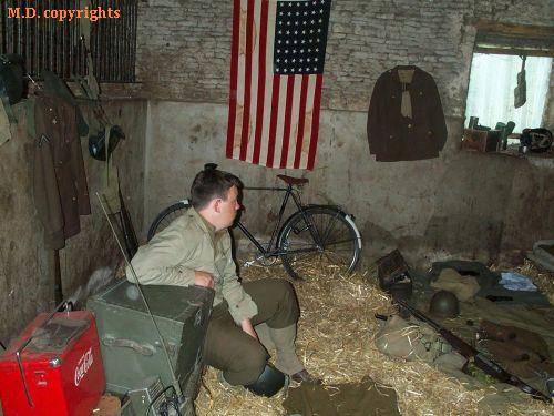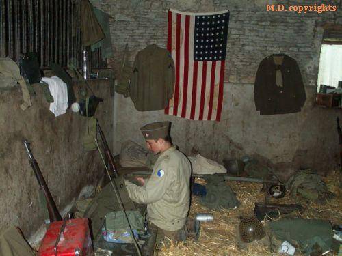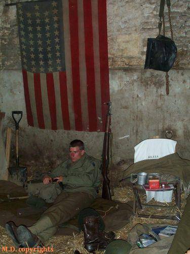 Aprés avoir manger, laver les gamelles, fait la toilette chacun retourne dans sa chambrée ou reste dehors à discuter. La nuit tombe et j'essaye de mettre en place mon lit pico, mais à peine allongé dessus, j'entend des bruits de tissus qui se déchirent, pour ne pas finir en sandwich je saute du lit et je vois des trous qui n'étaient pas présent avant :p alors je dormirais par terre cette fois ci. Aprés ça, une soirée commence dans ma chambrée avec mes camarde de chambres et amis de l'association, et au bout d'une heure toute l'assiociation française de la 29th infantry division FHA se retrouve dans cette étable à raconter leurs expériences du cinquantiéme anniversaire du 6 juin et des autres reconstitutions, ou encore comment faire pour se retrouver en sandwich dans un lit pico (ou lit de camp, ce que j'ai échapper de justesse :p ). Une soirée trés trés sympas qui se termina sur les coups de 4-5h00 du matin. Les anglais qui possédaient les vehiculent sont partis avec un GMC à Sainte-Mére L'église avec deux gars de la 29th FHA quelques minutes avant.
