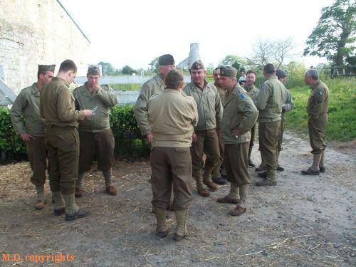 Nous nous habillons en tenue d'époque de soldat d'infanterie américaine de la seconde guerre mondiale, dans le camp une hierarchie trés stricte fut mise en place comme à l'époque, tout ceux qui possédaient un grade dans ce que l'on appel un squad, avait ce garde dans l'armée réélle ( nous ne prenons pas de grades que nous ne mérittons pas ) c'est pourquoi je suis un simple trouffion :). Chacun avait une tâche dans le camp, la cuisine ( faite dans les gamelles d'époque avec des boites de conserve ce qui se rapproche le plus des rations ), les sanitaires, remplir les gourdes, ranger les campements, messager, military police ( MP ), chauffeur ... Nous avons durant ce séjour été au "service" des vétérans qui nous on suivis le plus possible en fonction de leur état de santé et de fatigue et surtout en fonction du traffique routier de la région ( six cars ça passe pas facilement dans la campagne Normande ). Nous avons participé aux cérémonies, le plus possible, ayant pour théme la 29th ID dans toute la Normandie en honnorant les vétérans qui n'hésitaient pas aprés chaques cérémonies à nous raconter leurs histoires.