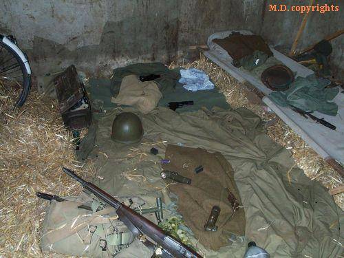 Retour du convoi au camp, en chantant, en disant bonjour aux passant qui nous interpellent et en s'amusant dans une ambiance trés trés cool et sympathique, le week end commence trés bien ;). De retour au camp j'installe mon barda, ma chambrée comme vous pouvez le voir n'est pas trés confortable mais au moins on a un toit ce qui n'était pas souvent le cas en 1944 pour tous les soldats. Je découvre plus précisément le camp. il n'est pas trés tard alors on a le temps de discuter, jouer et d'allé préparer à manger pour 60 soldats affamés par une journée au soleil de plomb, donc ma premiére corvée sera de faire à manger avec 2 autres cuisinier. L'ambiance est sympas, tout est fait comme à l'époque méme le four de campgane US est là. Une fois le diner prêt on appel tou les squads et tout le monde arrive avec ses gamelles et son quart pour venir manger autour de la "cuisine" et discuté, surtout rigolé car l'ambiance dans le camp sera toujours aussi joyeuse durant les 3 jours oû j'y étais.
