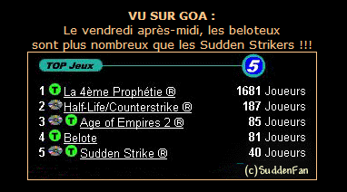 A propos, tant que j'y pense : vous avez été nombreux à répondre à notre sondage sur les différentes versions de Sudden Strike, et soyez rassurés, le dépouillement arrivera sous forme de dépêche sous peu. Les résultats ne sont pas perdus, et seront commentés et archivés avec les autres dès que je me serai rasé le poil que j'ai dans la ce sera humainement possible.