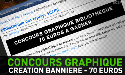 Premier rappel pour notre grand coucours graphique sur SC2FR. Starcraft 2 France, site du Réseau Jeux-Stratégie, vous propose de créer une bannière pour notre bibliothèque de replays Starcraft 2. Le vainqueur du concours repartira avec un bon Kadeos d'une valeur de 70 €. Pas mal pour créer une petite bannière non ?
