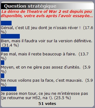 Le premier chiffre frappant est la grande proportion d'entre vous que Theatre of War 2 laisse de marbre (25,5 %). Un désintérêt que vient confirmer la faible participation à cette enquête. TOW 2 serait-il une niche pour joueurs pointilleux ?