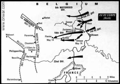 Aprés l'invasion du Luxembourg sans reél coups de feu dans la nuit du 9 au 10 mai , les troupes Allemandes pénètrent en Belgique à 5h45 et se retrouvent face au 3eme régiment de chasseurs ardennais Belge qui leurs donnent quelques soucis dans un terrain accidenté , au soir , le XV.AK(mot) reste bloqué devant les defenses Belge qui sont rejointes le 11 mai par les premiers éléments de la 4eme DLC conformément au plan allié. Cela n'empeche pas l'offensive Allemandes de reprendre plus violament et de bousculer les cavaliers français l'aprés midi dans le secteur de Marche. Les combats durent jusqu'au début de la soirée mais devant le nombre croissant de blindés appartenant essentielement de la 7eme PzDiv , les français décrochent et retraites à toute allure vers la Meuse afin de la franchir avant la déstruction des ponts par le genie. Le 12 mai au soir les premiers éléments Allemands du groupe Hoth sont entre Dinant et Anhée sur la rive Est .