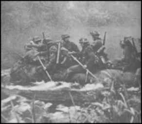 15h, les Stosstrupp du 4eme Schutzen-Regiment s’élancèrent sur de canots pneumatiques de part et d’autre de l’unique pont détruit. Les premières vagues seront repoussées sur les berges mais les panzers entrèrent en action sur la rive droite et pilonnèrent en tirs de soutien, les casemates des vaillants défenseurs. Vers 17 h, les Allemands prirent pied sur l’autre rive et repoussèrent méthodiquement les ennemis trop proche du pont afin de couvrir les Pionniers qui commencèrent à établir une première passerelle sur les anciennes structures, ce fut chose faite en quelques heures !