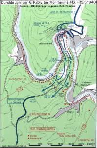 A 3h30 il relança les fusiliers à l’assaut mais cette fois ci appuyés par les canons des panzers qui débouchèrent vers 9h. La résistance continua mais dans la matinée, une nouvelle menace apparut sur la droite. Les panzers de la 8eme Pz.Div de Kuntzen ayant franchit la Meuse dans la nuit d’avant, vinrent prêter mains fortes au XLI.AK en difficulté . La manœuvre encercla les derniers défenseurs qui durent faire retraite ou se constituer prisonniers. Avant midi le 15 mai, la tête de pont de Monthermé fut officiellement sécurisée.