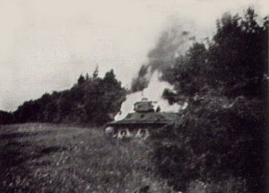 Un cliché "banal"d'un char R-35 français abandonné apres une escarmouche , en arriere plan l'ont vois un panzer III sur la route |