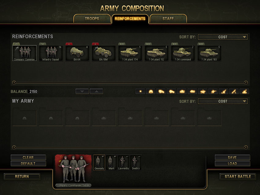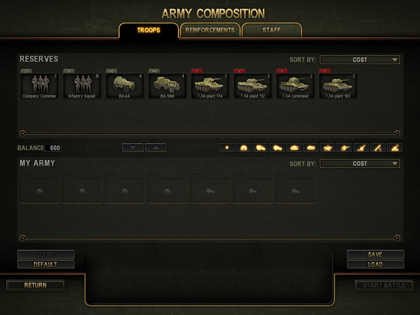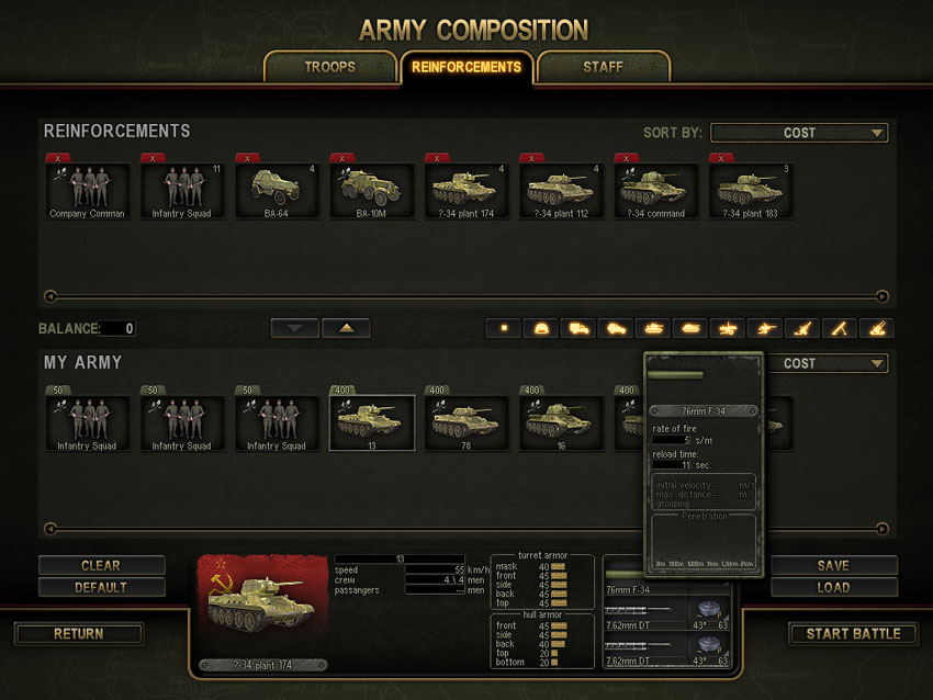 A noter que les 5T34 apparaitront au cours de la partie, mais les 3 groupes d'infanterie, ce n'est pas très clair, car ils ne sont pas venu avec les chars...