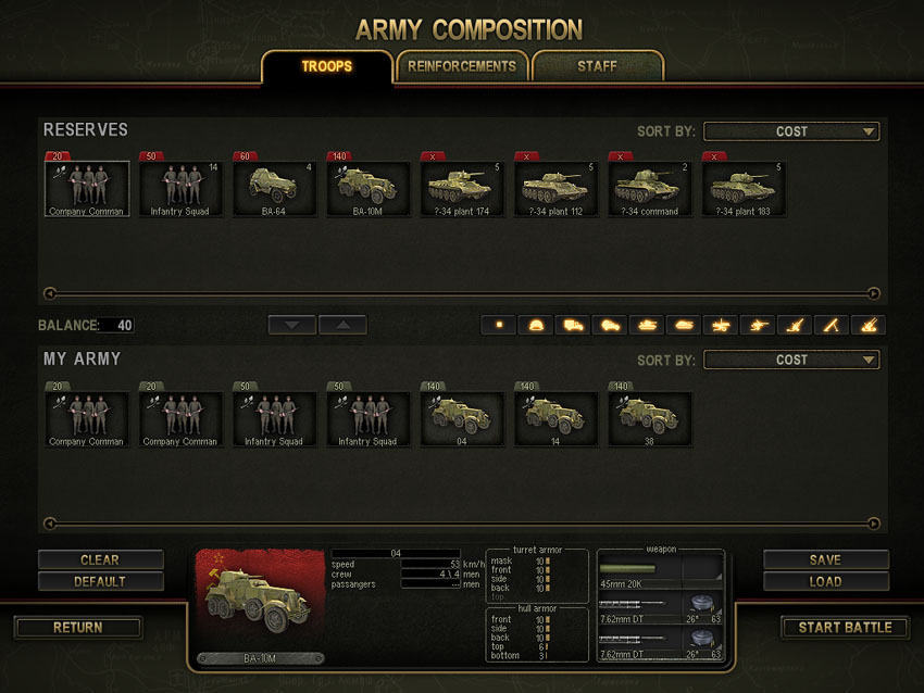 Je choisis trois BA10, deux sections d'infanterie et deux groupes d'artilleurs.