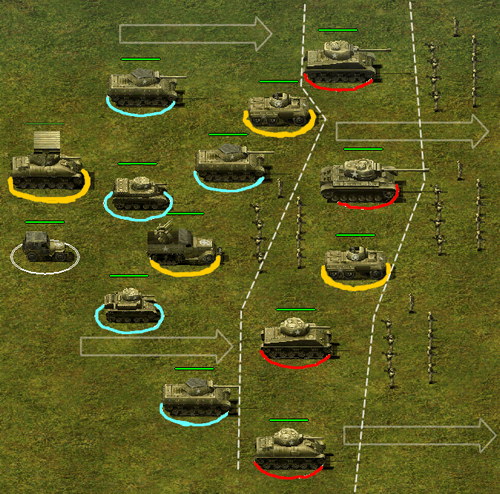 Les chars légers/moyens avec les automitailleuses/DCA motorisé se situent légérement en arrière, prêt à prendre le relais sur des postions ennemies tel que l'infanterie (tranchées) ou les canons anti-chars (servants)